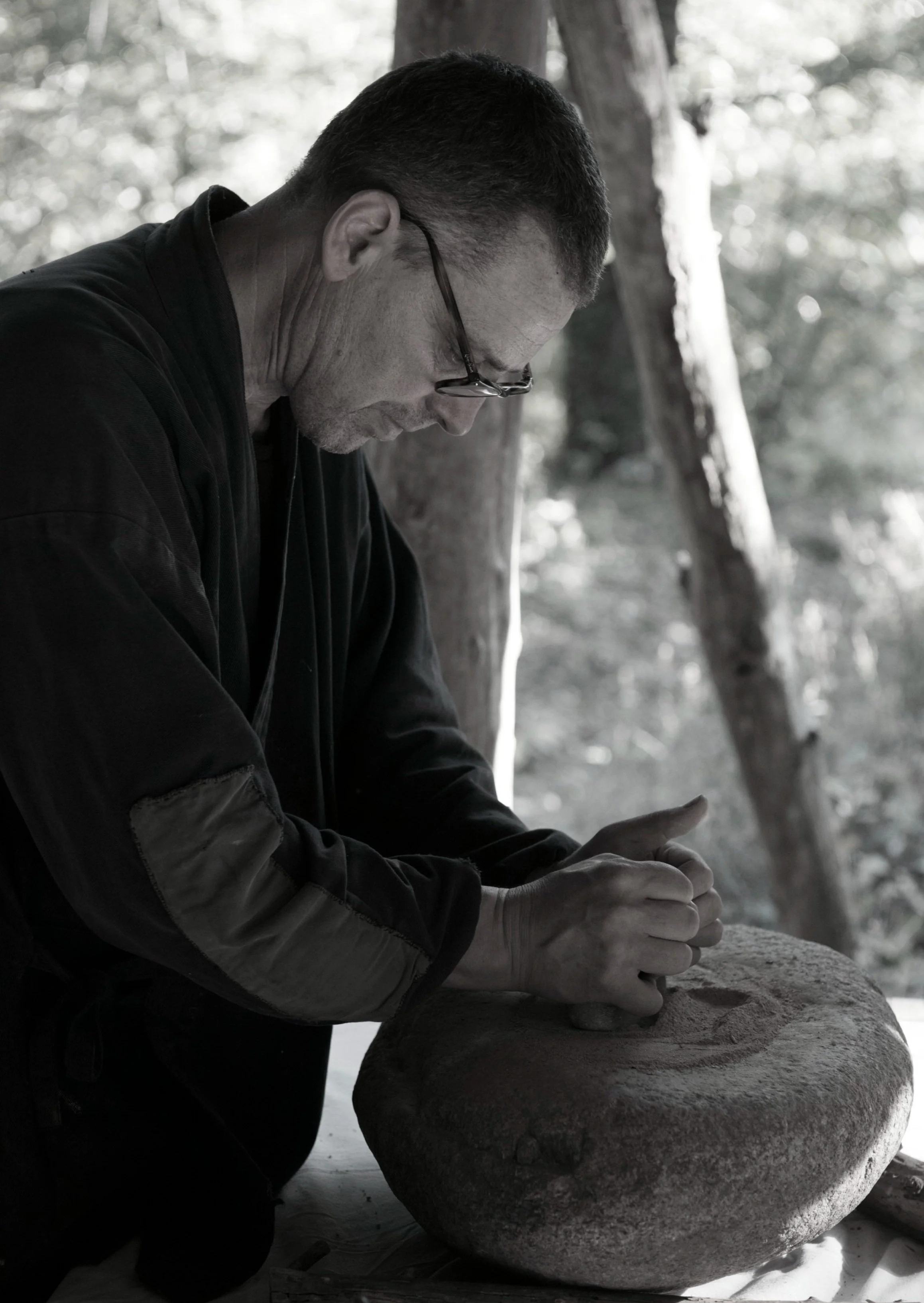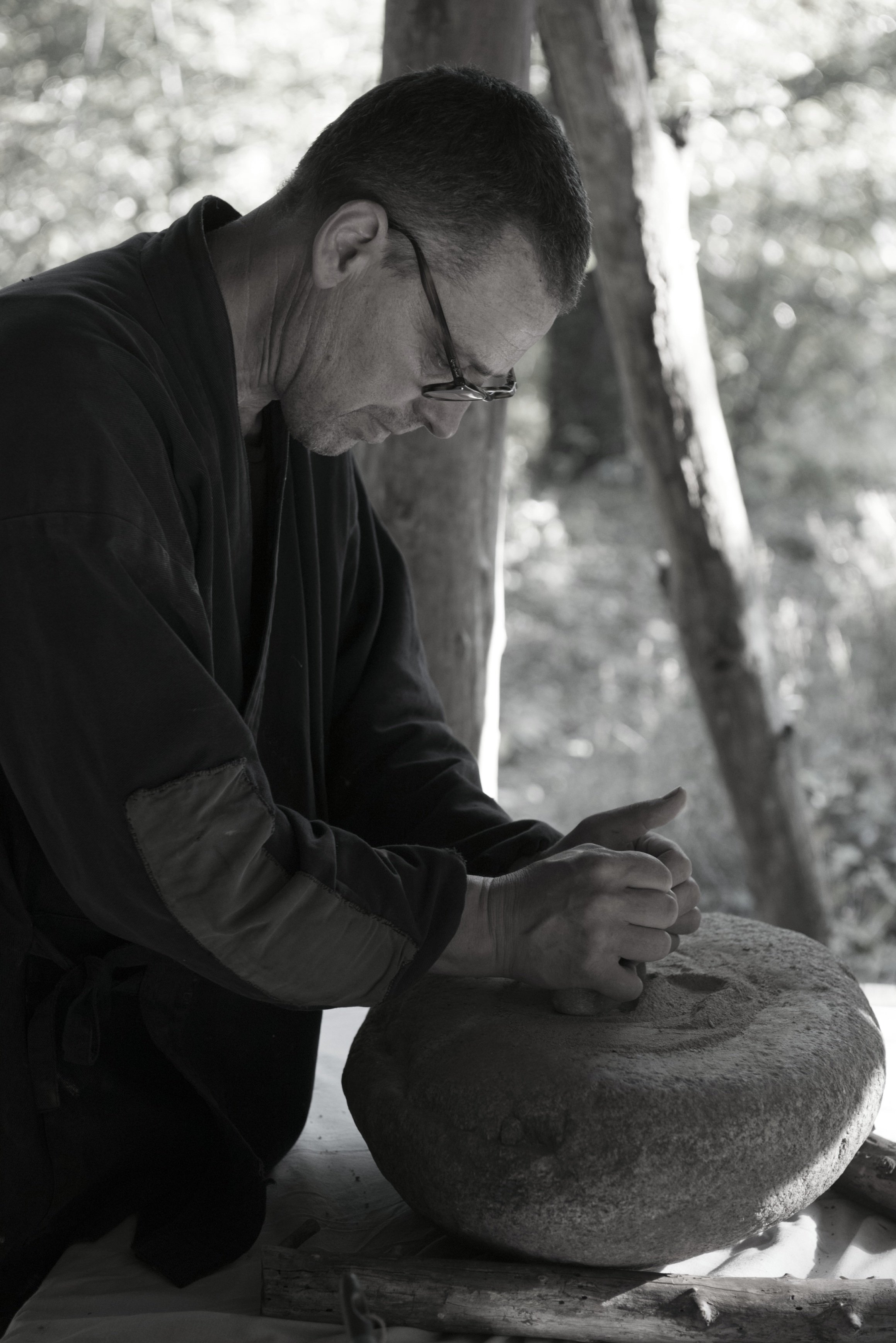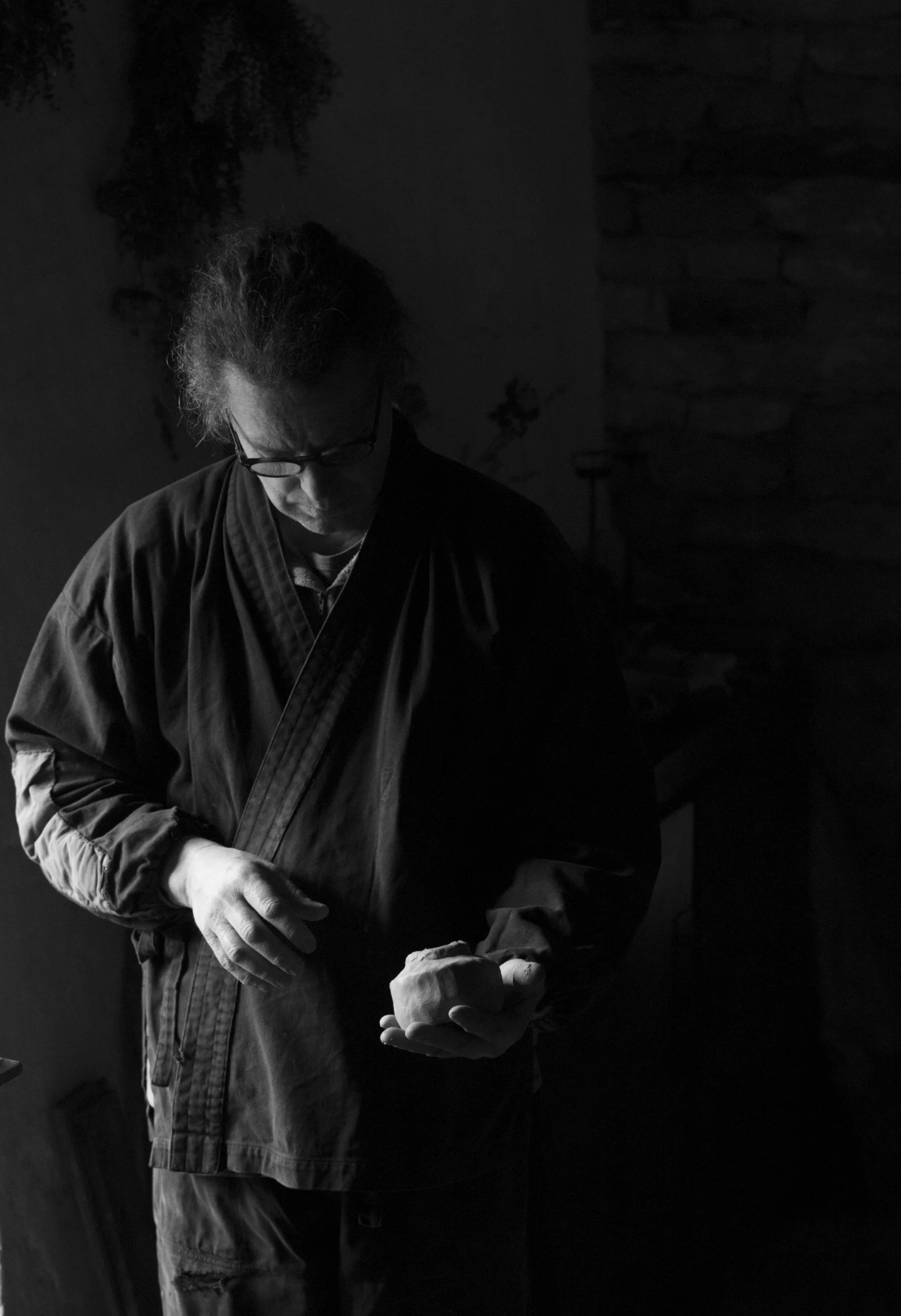With these materials, transformed by wind, rain and frost, he mixes clays and glazes. The moment of modeling the clay: under the slow, continuous pressure of the fingers, in the hollow of the hand, clay becomes bowl.